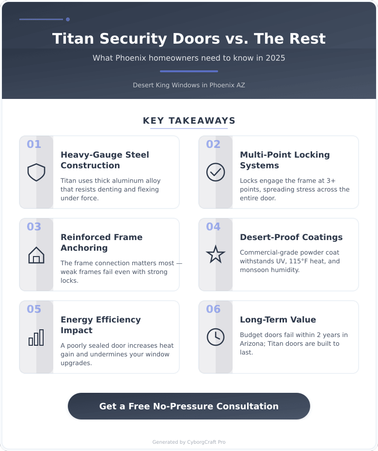 This guide focuses specifically on how Titan security doors compare to standard options, what Phoenix and Scottsdale homeowners should look for in 2025, and how to make the right call before you buy.
